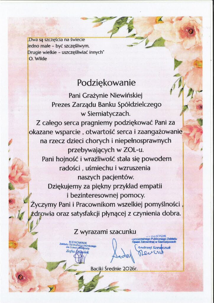 Bank Spółdzielczy w Siemiatyczach łączy działalność biznesową z działalnością społeczną włączając się w różnorodne inicjatywy: kulturalne, społeczne i charytatywne – służące szeroko pojętemu rozwojowi lokalnego środowiska.